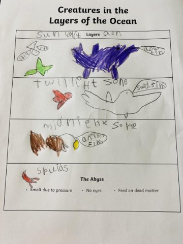 The children in Class One have taken a great interest in the ocean and what lurks in the waters of the ocean zones. As part of our David Attenborough week we explored a clip from one of his popular documentaries 'Blue Planet' and then research the ocean zones. the children then created their own ocean zone picture. Well done Class One!