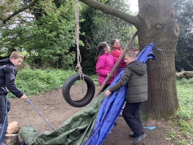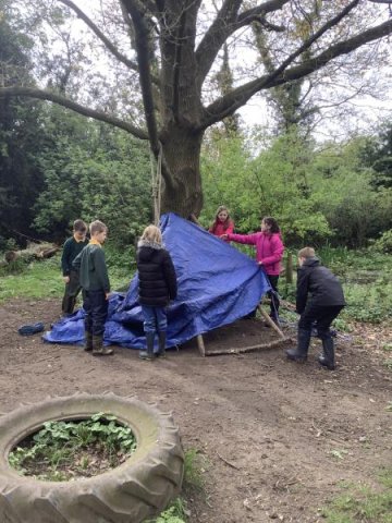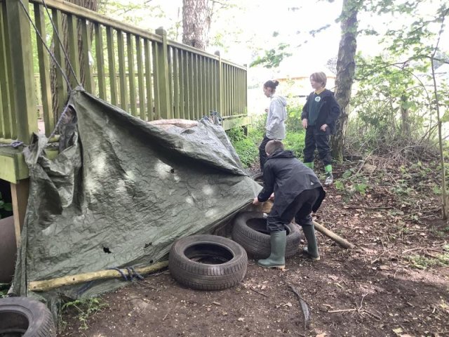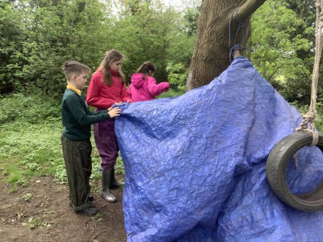 Today in forest schools class 3 were given the challenge of building a waterproof shelter in 20 minutes. They had to use their skills of planning, adapting, team work and imagination to create a shelter big enough to keep the whole group dry!
