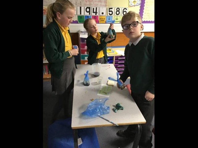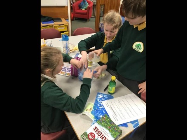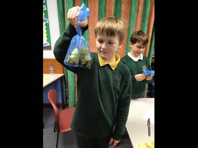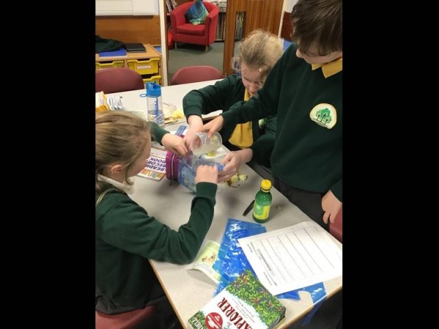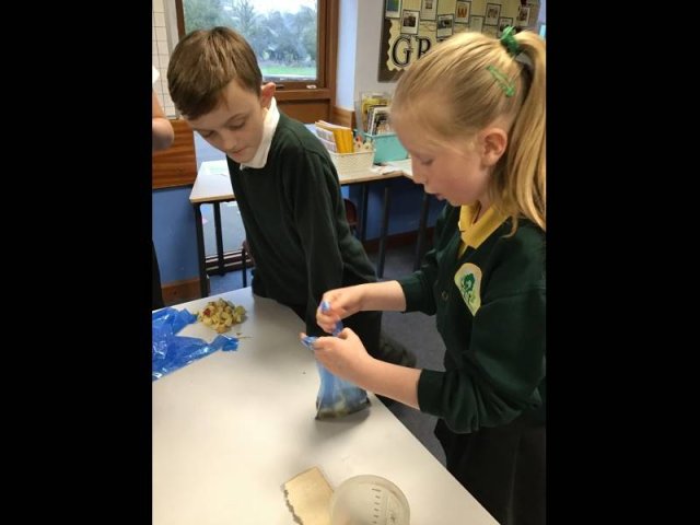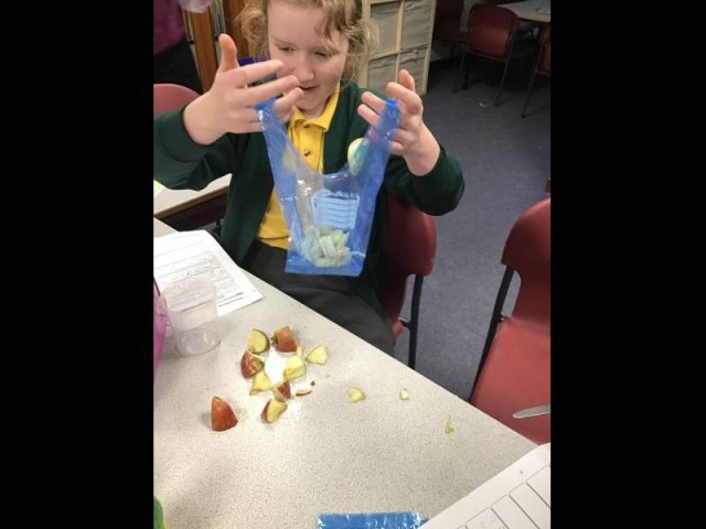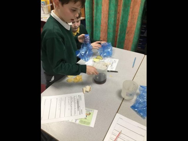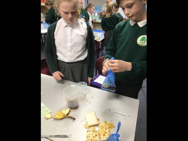 Today, the children had great fun, squashing, squeezing and scrunching food in food bags. Why? Well, the food bags were acting as our stomachs. They children then added either coke, vinegar or lemon juice to act as stomach acid. They then got to work 'pummelling' the food, just like our stomach does.