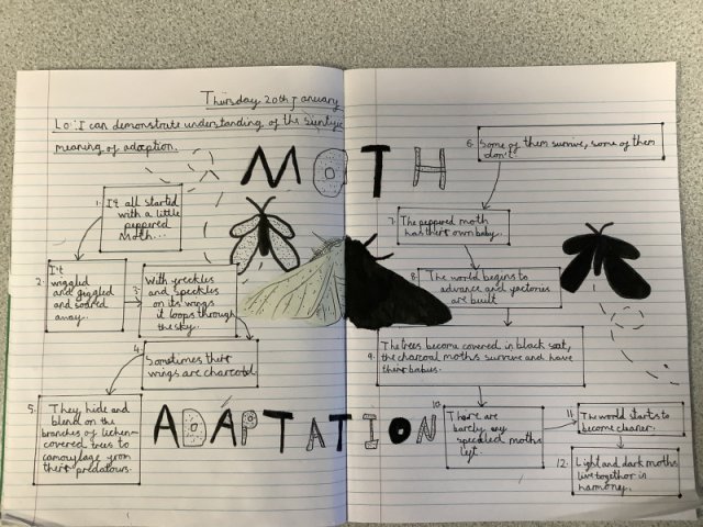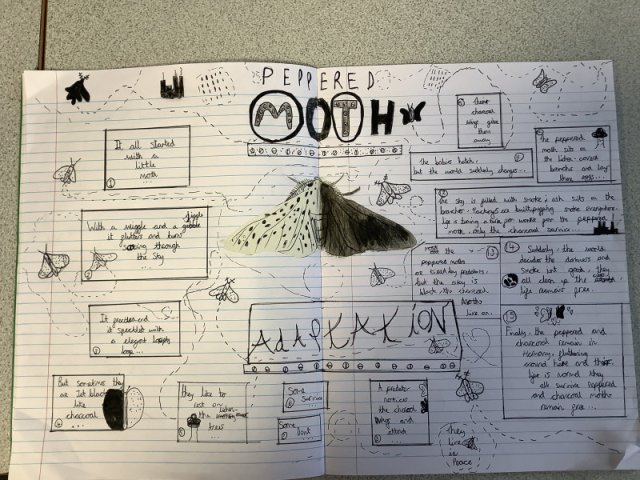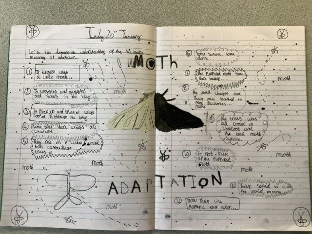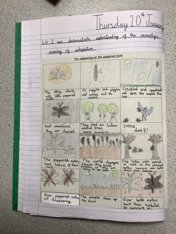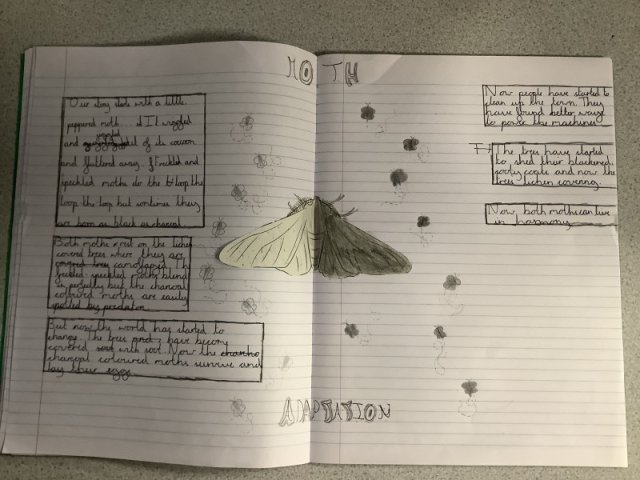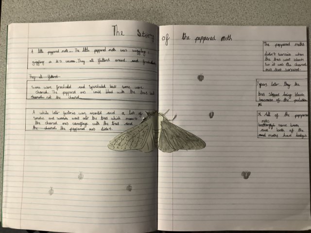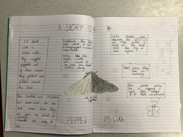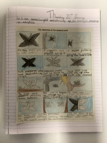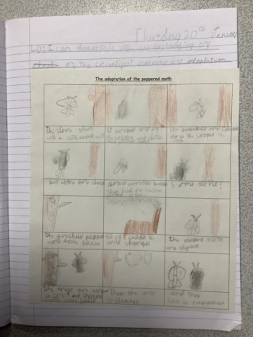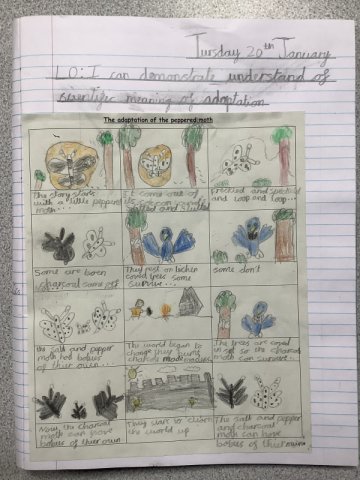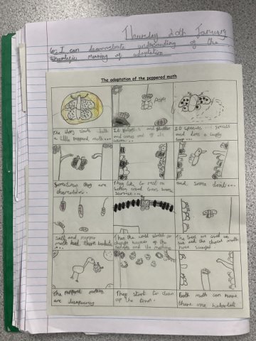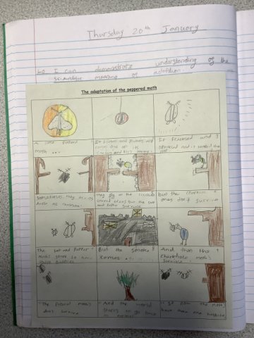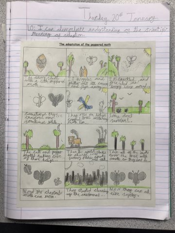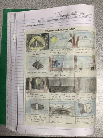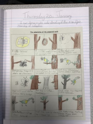 This story really engaged the children and helped them develop a fantastic knowledge on adaptation. The work they created is fabulous! Year 4 had to create a comic strip of the story of the Peppered Moth's adaptation, while Years 5 and 6 created a double page spread.