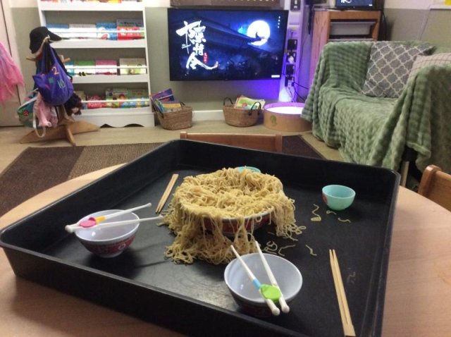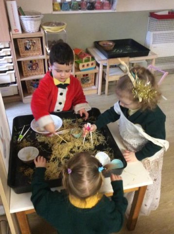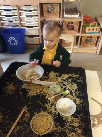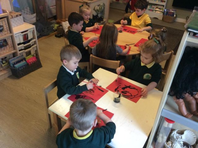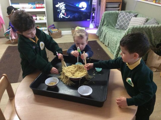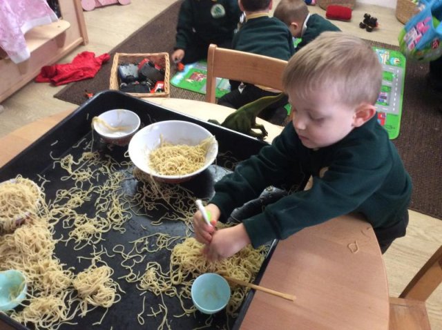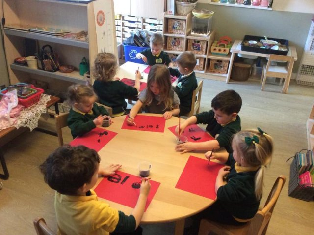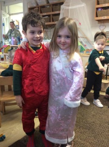 The nursery children have celebrated the Chinese culture today by taking part in some lovely activities linked to Chinese new year! They dressed in Chinese clothing, practiced painting the Chinese alphabet and used chopsticks to help develop their fine motor skills!